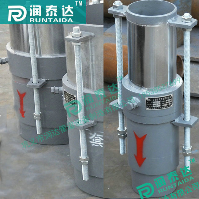 套筒補(bǔ)償器可分為單向型補(bǔ)償器和雙向型補(bǔ)償器兩種結(jié)構(gòu),雙向型補(bǔ)償器的特點(diǎn)是不論介質(zhì)從補(bǔ)償器何端流入,其補(bǔ)償器兩端的滑動(dòng)套筒總是自由滑動(dòng),達(dá)到雙向補(bǔ)償作用,增大補(bǔ)償量。而單向型補(bǔ)償器的特點(diǎn)是介質(zhì)只能從補(bǔ)償器一端流入,補(bǔ)償器的滑動(dòng)套筒一端滑動(dòng)起到補(bǔ)償作用。適用于介質(zhì)壓力≤2.5MPa,介質(zhì)溫度-40℃~600℃的管道工程。套筒式補(bǔ)償器采用新型的密封材料柔性石墨環(huán),其具有強(qiáng)度大,摩擦系數(shù)?。?.04~0.10),不老化,效果好,維修方便等特點(diǎn)。疲勞壽命與管道相當(dāng)。滑動(dòng)表面經(jīng)特殊處理,在鹽水、鹽溶液等環(huán)境下耐腐蝕性能好,比奧氏體不銹鋼高50倍以上。同時(shí),多年后補(bǔ)償器因磨損導(dǎo)致密封效果減弱時(shí),可再次緊固法蘭,增強(qiáng)密封性能,也可將螺栓松開,取下壓圈,再裝進(jìn)一層或兩層密封環(huán),壓緊壓圈,繼續(xù)使用。